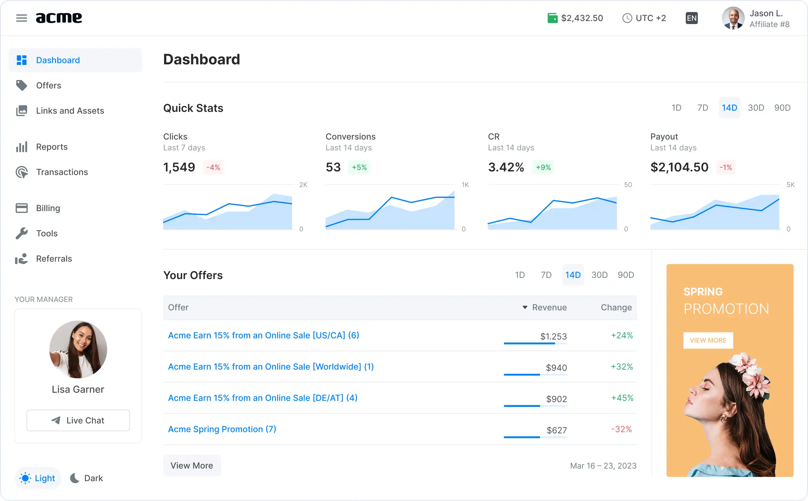 Manage multiple advertisers and affiliates in one platform. Scale with dedicated dashboards and flexible commission structures.